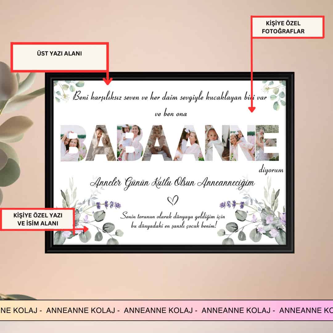 Anneler günü hediyeni hemen göndermek için siparişini buradan oluştur ve sipariş numaran ile birlikte whatsapptan veya instagramdan bizimle iletişime geç. Sipariş numaranız ile birlikte fotoğrafınızı rica ediyoruz. 8 Fotoğraflı BABAANNE tablo için yaklaşık 12 adet fotoğraf istiyoruz bu fotoğrafların içinden harflere uygun 8 fotoğraf seçilerek tasarım hazırlanmaktadır. anneye doğum günü hediyeleri babaanne